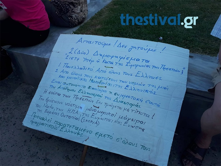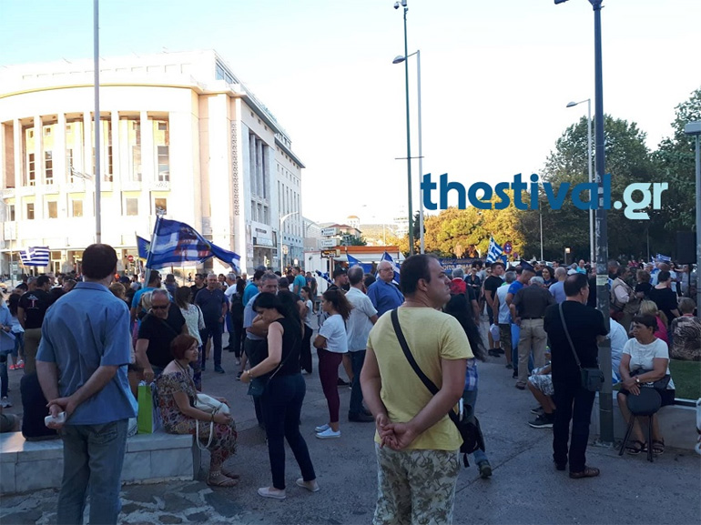Οι συγκεντρωμένοι κρατώντας ελληνικές σημαίες φωνάζουν συνθήματα για την ελληνικότητα της Μακεδονίας, καθώς επίσης και κατά των πολιτικών.