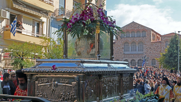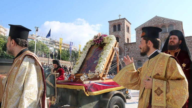 Προηγήθηκε η Αρχιερατική Θεία Λειτουργία που τέλεσε ο μητροπολίτης Θεσσαλονίκης Άνθιμος, ενώ το απόγευμα θα γίνει πανηγυρικός αρχιερατικός εσπερινός.