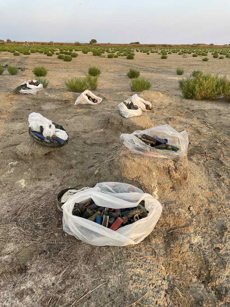 «Ενδεικτικό του προβλήματος είναι ότι κάποια βρίσκονταν στις φωλιές των φλαμίνγκο, αφού τα πουλιά, στην προσπάθειά τους να φτιάξουν τις φωλιές τους, μετέφεραν μαζί με τη λάσπη και τα φυσίγγια» λέει η κα. Καραγιάννη προσθέτοντας ότι με την ευκαιρία μαζεύτηκαν κι άλλα σκουπίδια, αν και τα φυσίγγια ήταν η πλειονότητα των σκουπιδιών.