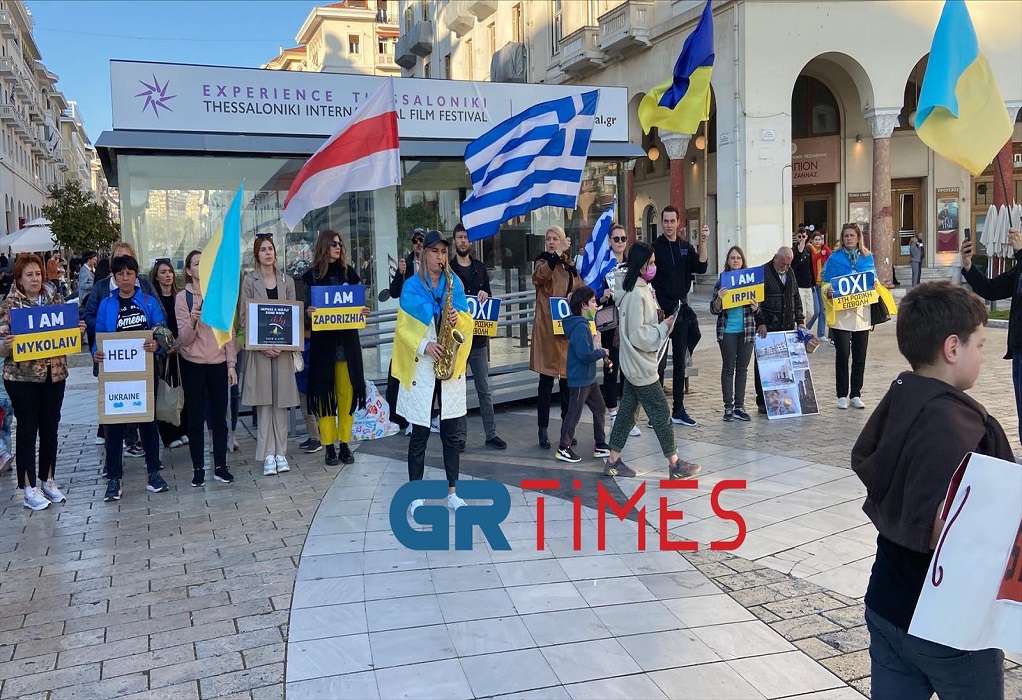 Ανήμερα της 25ης Μαρτίου Ουκρανοί πολίτες παρευρέθηκαν στην Πλατεία Αριστοτέλους με ελληνική «απόχρωση» για να τονίσουν την αντίθεση τους για τον πόλεμο στην Ουκρανία.