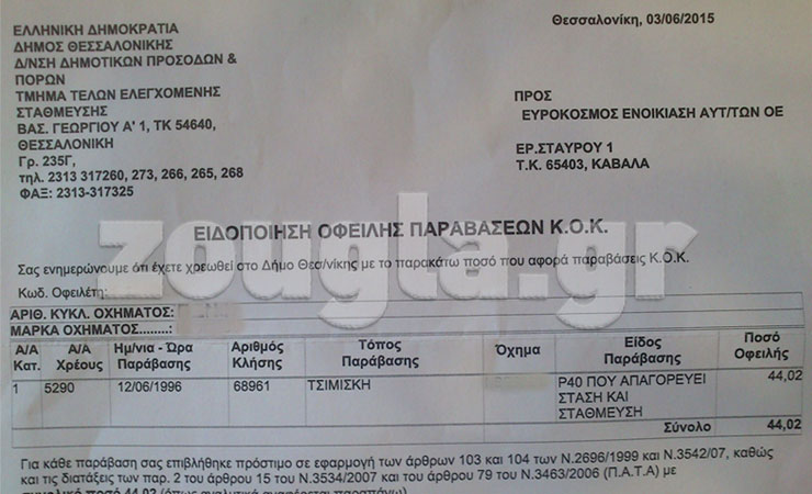 Αναγνώστης του zougla.gr έλαβε ειδοποιητήριο από τον Δήμο Θεσσαλονίκης για να πληρώσει μια κλήση παράνομης στάθμευσης με το ποσό των 44 ευρώ.