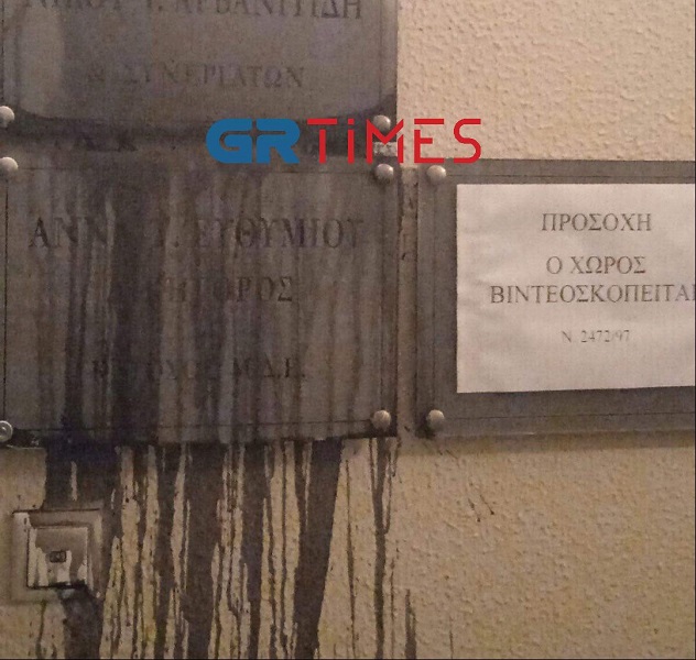 Οι άγνωστοι μπήκαν στην πολυκατοικία, πέταξαν μπογιές στην είσοδο του γραφείου και τράπηκαν σε φυγή.
