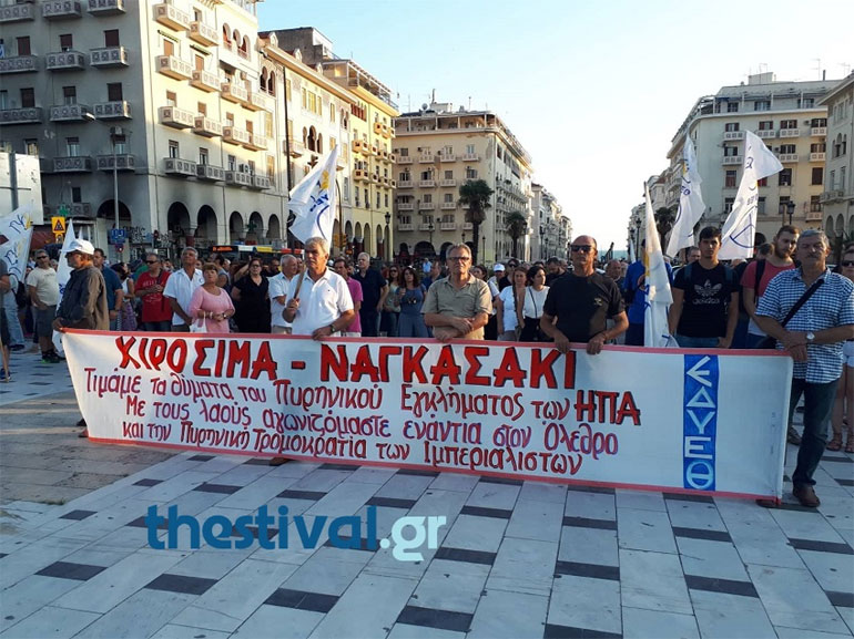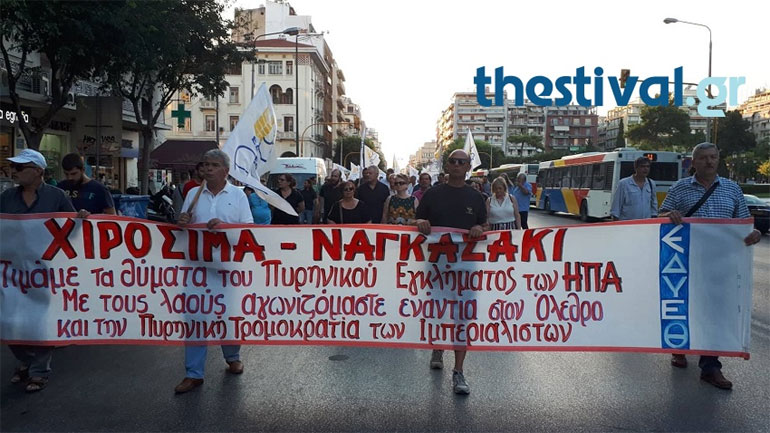 Ολοκληρώθηκε η πορεία σε κεντρικούς δρόμους της Θεσσαλονίκης για τη συμπλήρωση των 73 χρόνων από τη ρίψη ατομικής βόμβας στη Χιροσίμα και το Ναγκασάκι, την οποία διοργάνωσαν τα μέλη της επιτροπής για τη Διεθνή Ύφεση και την Ειρήνη.
