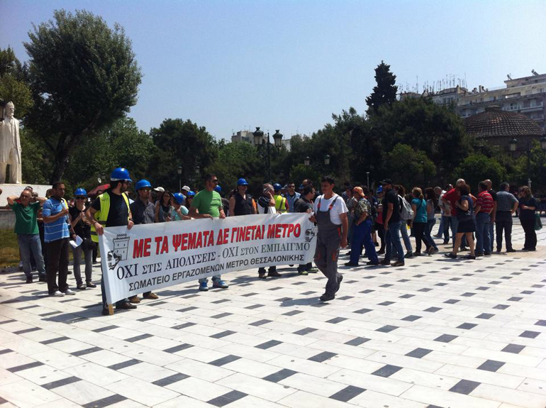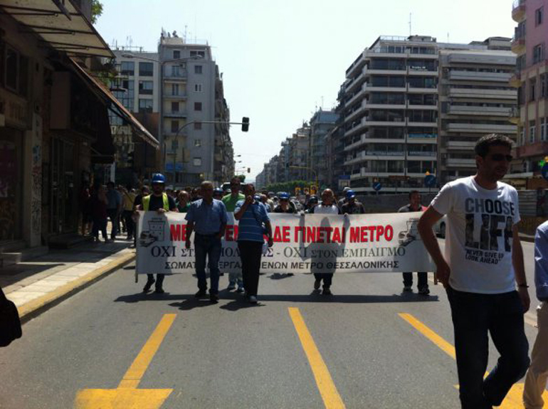 Πορεία στο κέντρο της Θεσσαλονίκης πραγματοποιούν αυτή την ώρα οι εργαζόμενοι στο ΜΕΤΡΟ της Θεσσαλονίκης διαμαρτυρόμενοι για τις απολύσεις, οι οποίες όπως καταγγέλλουν θα έχουν ως αποτέλεσμα το σφράγισμα των εργοτάξιων.