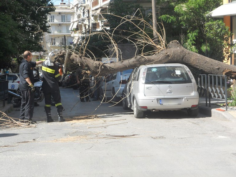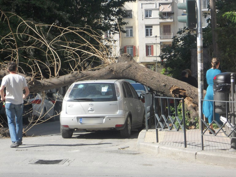 Πάνω στην οροφή αυτοκινήτου έπεσε το πρωί της Παρασκευής ένα δέντρο στην οδό Κασσάνδρου στη Θεσσαλονίκη.