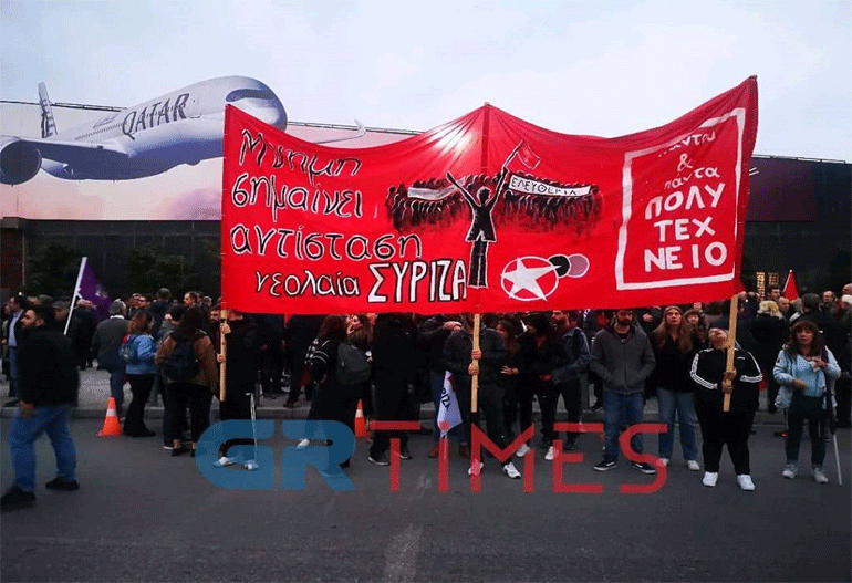 Στην πρώτη πορεία συμμετέχουν μέλη του ΚΚΕ, του ΠΑΜΕ, φοιτητικοί σύλλογοι και μαθητές ενώ στην κεφαλή της βρίσκονται μέλη του Συνδέσμου Φυλακισθέντων και Εξορισθέντων Αντιστασιακών 1967-1974 που κρατούν πανό.