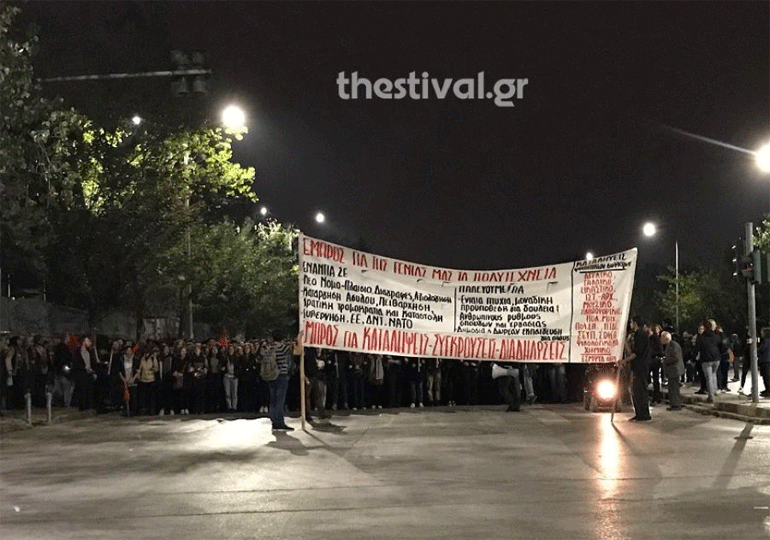 Μπροστά από το Πολυτεχνείο επί της Εγνατίας Οδού ξεκίνησαν μετά τις 18.00 το απόγευμα τρεις διαφορετικές πορείες που κινούνται μέσω κεντρικών δρόμων προς το αμερικανικό προξενείο στην Τσιμισκή.