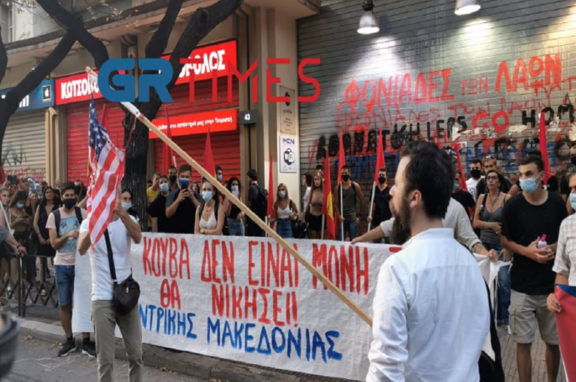 Κρατώντας σημαίες της ΚΝΕ και πανό που έγραφαν «κάτω τα χέρια από την Κούβα! Αλληλεγγύη στον Κουβανικό λαό» και «η Κούβα δεν είναι μόνη της θα νικήσει», οι συγκεντρωμένοι εξέφρασαν την αλληλεγγύη τους στον λαό της χώρας. Μάλιστα, λίγο πριν ολοκληρωθεί η συγκέντρωση, έκαψαν μια σημαία της ΗΠΑ, έξω από το προξενείο.
