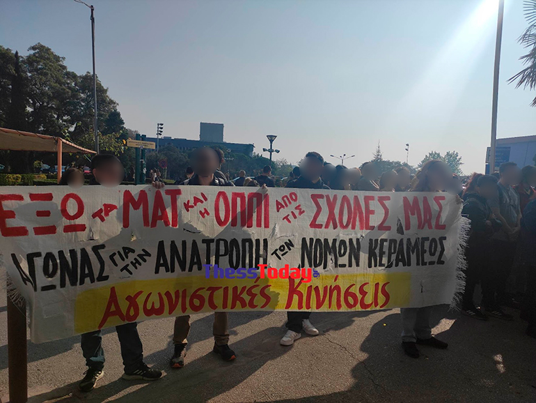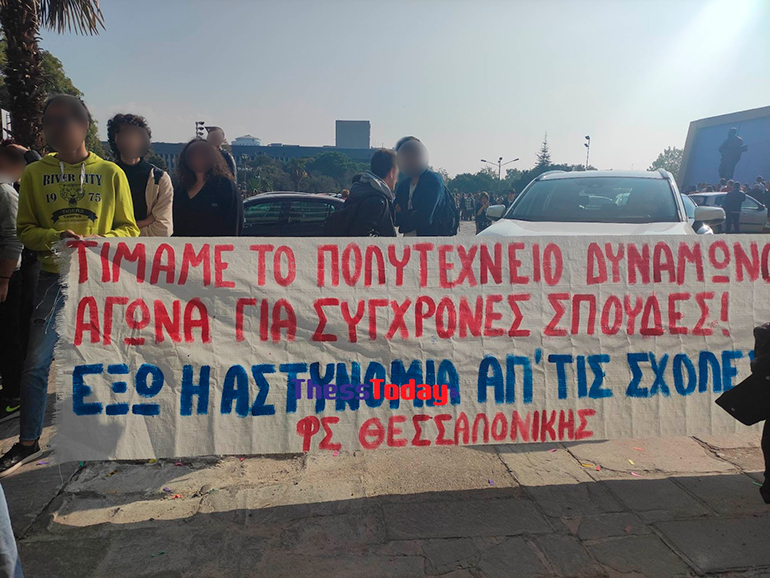 Με κεντρικό σύνθημα «σε κάθε γωνιά υπάρχει αστυνομία, η χούντα δεν τελείωσε το ’73» οι φοιτητικοί σύλλογοι απαιτούν την απομάκρυνση των δυνάμεων των ΜΑΤ από το πανεπιστημιακό ίδρυμα, ενώ σε πανό τους μεταξύ άλλων αναγράφεται «έξω τα ΜΑΤ και η ΟΠΠΙ από τις σχολές μας».