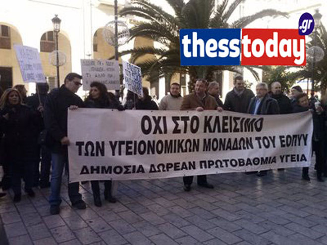 Έξω από τη διοίκηση της υγειονομικής περιφέρειας Μακεδονίας-Θράκης, στο πλακόστρωτο της Αριστοτέλους συγκεντρώθηκαν νωρίτερα γιατροί του ΕΟΠΥΥ, κρατώντας πανό και πλακάτ με συνθήματα και μαύρες σημαίες, για να διαμαρτυρηθούν για τις σχεδιαζόμενες αλλαγές στο σύστημα της υγείας, που θα πλήξουν γιατρούς και ασφαλισμένους.
