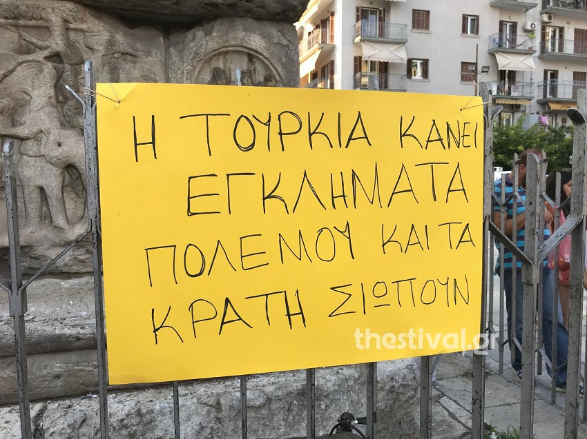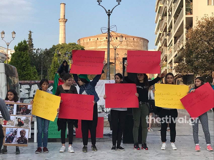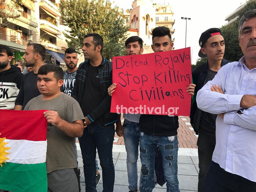 Συγκέντρωση ενάντια στην τουρκική εισβολή στη Συρία πραγματοποιούν αυτή την ώρα στην πλατεία Καμάρας μέλη της Κουρδικής Κοινότητας της Θεσσαλονίκης.