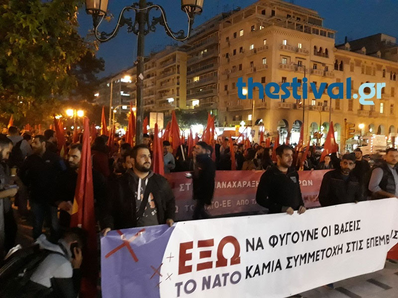 Οι συγκεντρωμένοι ζητούν την έξοδο του ΝΑΤΟ από την Ελλάδα καθώς και των βάσεων του.
