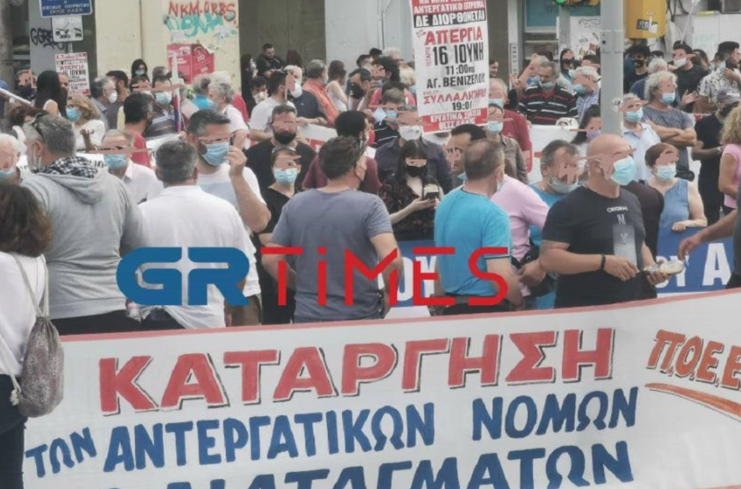 Κρατώντας πανό και φωνάζοντας συνθήματα όπως «κάτω από τα χέρια από το 8ωρο, δεν είναι για παζάρια και για διάλογο» και «Χωρίς εσένα γρανάζι δεν γυρνά, εργάτη μπορείς χωρίς αφεντικά», τα μέλη συνδικάτων και εργατικών σωματείων τονίζουν ότι “δε θα επιτρέψουμε τον εργασιακό μεσαίωνα, το νομοσχέδιο έκτρωμα θα μείνει στα χαρτιά”.