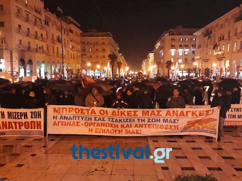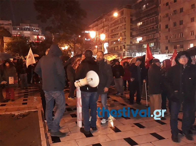 Συλλαλητήριο ενάντια στον προϋπολογισμό του 2019 που κατατέθηκε στη Βουλή, πραγματοποίησε απόψε το ΠΑΜΕ στο άγαλμα Βενιζέλου, στο κέντρο της Θεσσαλονίκης.
