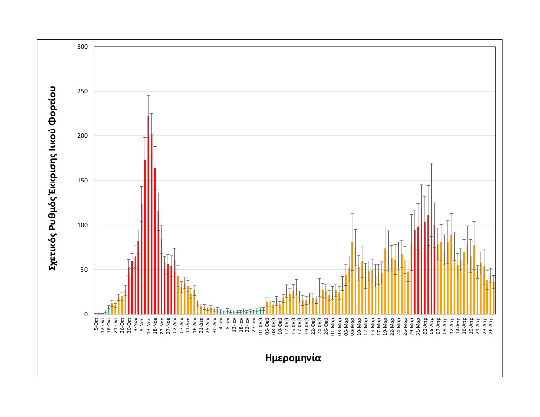 Η τάση αποκλιμάκωσης που ξεκίνησε στις 7 Απριλίου συνεχίζεται και την τρέχουσα εβδομάδα και, όπως φαίνεται στα διαγράμματα που παρουσιάζει το ΑΠΕ-ΜΠΕ, σε απόλυτες τιμές το ιικό φορτίο μετράται πλέον στο 1/3 της υψηλότερης τιμής της περιόδου, που καταγράφηκε στις 5 Απριλίου.