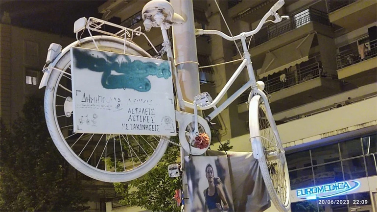 Άγνωστοι βανδάλισαν το λευκό ποδήλατο που έχει τοποθετηθεί στη συμβολή των Αγίου Δημητρίου και Γρηγορίου Λαμπράκη στη μνήμη της αθλήτριας Δήμητρας Ιορδανίδου που έχασε τη ζωή της σε τροχαίο δυστύχημα τον Νοέμβριο του 2021, όταν το ποδήλατό της παρασύρθηκε από διερχόμενο φορτηγό και την τραυμάτισε θανάσιμα.