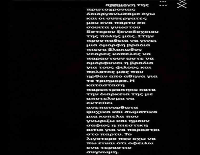 «Την παραμονή της Πρωτοχρονιάς διοργανώσαμε εγώ και οι συνεργάτες μου ένα πάρτι σε σουίτα γνωστού πεντάστερου ξενοδοχείου της πόλης μας. Στην προσπάθεια να γίνει μια όμορφη βραδιά, πίεσα βλακωδώς νεαρές κοπέλες να παραστούν ώστε να ομορφύνει η βραδιά για τους φίλους και πελάτες μας, που ήρθαν από την Αθήνα για το τριήμερο. Η κατάσταση παρεκτράπηκε κατά τη διάρκεια της νύχτας, με αποτέλεσμα να εκτεθεί ανεπανόρθωτα ψυχικά και σωματικά μια κοπέλα που γνωρίζω, και ήμουν σαφώς η πιεστική αιτία για να παραστεί στο πάρτι. Το λιγότερο που έχω να πω είναι ότι οφείλω ένα τεράστιο συγγνώμη», έγραψε στο Instagram ένας εκ των φερόμενων δραστών.