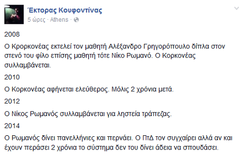 «Ο Κρορκονέας εκτελεί τον μαθητή Αλέξανδρο Γρηγορόπουλο δίπλα στον στενό του φίλο επίσης μαθητή τότε Νίκο Ρωμανό. Ο Κορκονέας συλλαμβάνεται», γράφει, προσθέτοντας πως το 2010 -μόλις δύο χρόνια μετά- ο Κορκονέας αφέθηκε ελεύθερος.