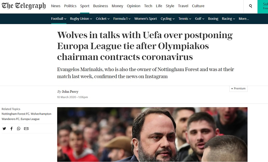 H ανακοίνωση του Βαγγέλη Μαρινάκη ότι διαγνώστηκε με κορωνοϊό, όπως είναι φυσικό, απασχόλησε και τα αγγλικά ΜΜΕ.