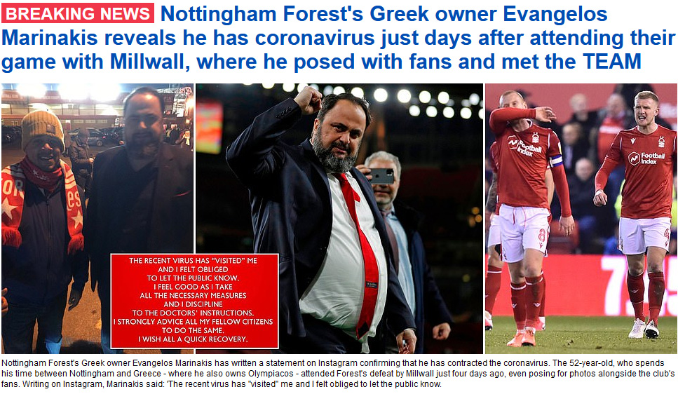 «Η Νότιγχαμ Φόρεστ επιβεβαιώνει ότι ο ιδιοκτήτης της Ευάγγελος Μαρινάκης βρέθηκε θετικός στον κορωνοϊό.