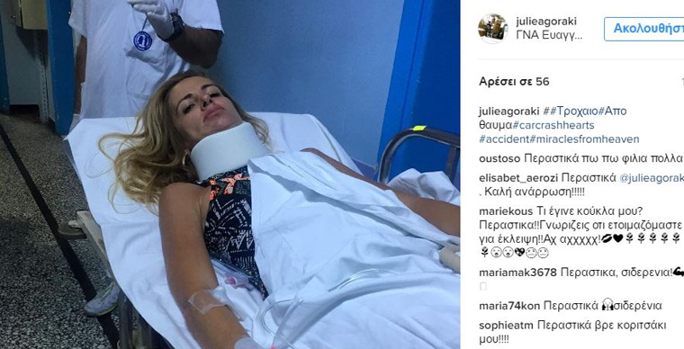 Η εικόνα που ανήρτησε στο Instagram, στην οποία εμφανίζεται να φοράει κολάρο συνοδεύεται από τη λεζάντα: «Τροχαιο#Απο θaύμα#carcrashhearts #accident#miraclesfromheaven».