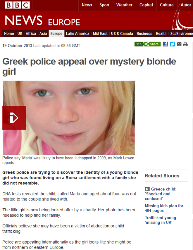 Το BBC εστιάζει την προσοχή του στην έκκληση που έχει κάνει η Ελληνική αστυνομία για να βρεθούν οι γονείς της Μαρίας. «Η Ελληνική αστυνομία κάνει έκκληση για το μυστήριο ξανθό κορίτσι» είναι ο τίτλος στην ιστοσελίδα του βρετανικού δικτύου.