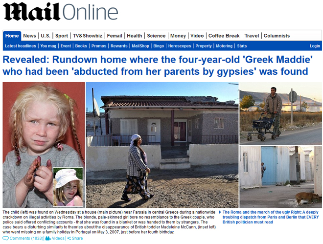 Η εφημερίδα Daily Mail σε πρωτοσέλιδο άρθρο της φέρει τίτλο «Το μυστήριο της Μαρία βαθαίνει καθώς οι ελληνικές Αρχές αποκάλυψαν ότι το τετράχρονο ξανθό κορίτσι που έχει απαχθεί από Ρομά μιλάει μόνο μια δυσνόητη γλώσσα τους».