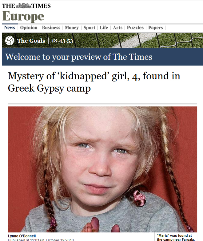 Η εφημερίδα Times γράφει: «Μυστήριο από την «απαγωγή ενός κοριτσιού 4 ετών που βρέθηκε σε καταυλισμό Ρομά στην Ελλάδα».