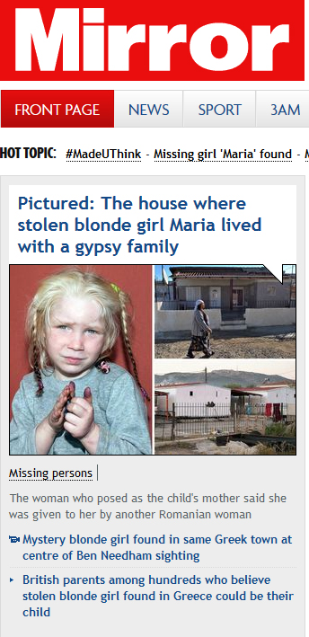 Η εφημερίδα Daily Mail σε πρωτοσέλιδο άρθρο της φέρει τίτλο «Το μυστήριο της Μαρία βαθαίνει καθώς οι ελληνικές Αρχές αποκάλυψαν ότι το τετράχρονο ξανθό κορίτσι που έχει απαχθεί από Ρομά μιλάει μόνο μια δυσνόητη γλώσσα τους».