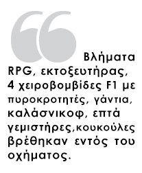 Από τον έλεγχο εντοπίστηκαν τέσσερα βλήματα RPG, τέσσερις προωθητικοί μηχανισμοί, ένας εκτοξευτήρας RPG, τέσσερις αμυντικές χειροβομβίδες F1 με πυροκροτητές, τρία καλάσνικοφ, επτά γεμιστήρες καλάσνικοφ, γάντια και κουκούλες.
