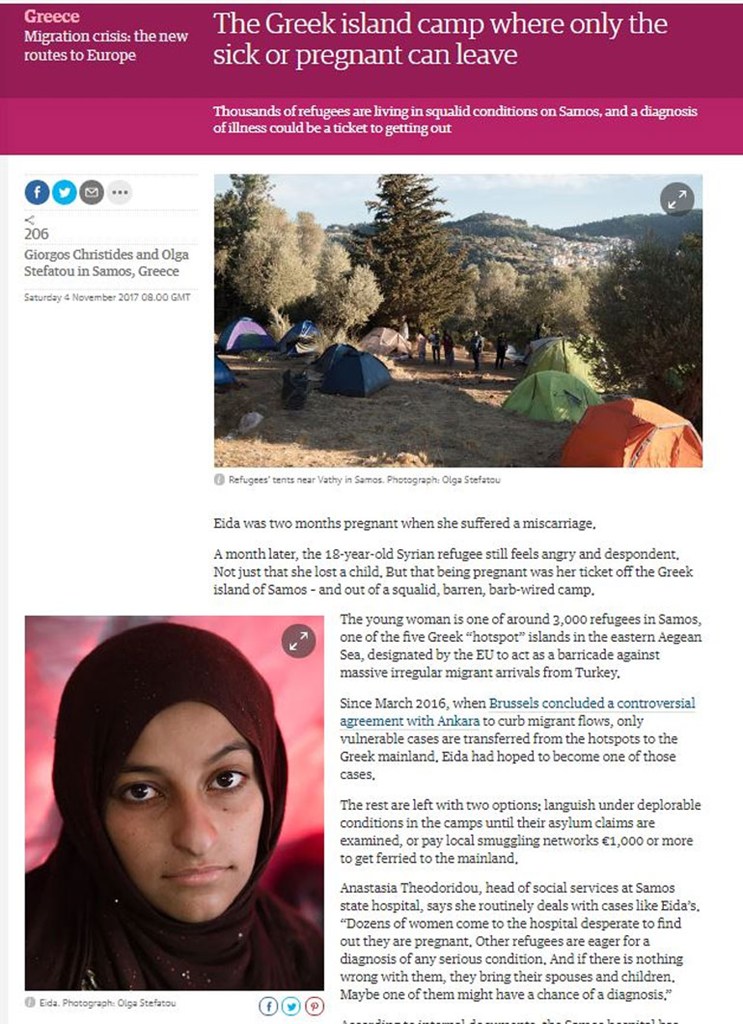 «Η Εϊντά ήταν δύο μηνών έγκυος όταν απέβαλε. Ένα μήνα αργότερα, η 18χρονη Σύρια αισθάνεται ακόμη θυμωμένη και μελαγχολική. Όχι μόνο επειδή έχασε ένα παιδί. Αλλά και γιατί αυτό το παιδί ήταν το “εισιτήριό” της για να φύγει από το ελληνικό νησί της Σάμου, όπου έμενε σε ένα άτακτο, άγονο και περιφραγμένο στρατόπεδο» υπογραμμίζεται στο άρθρο.