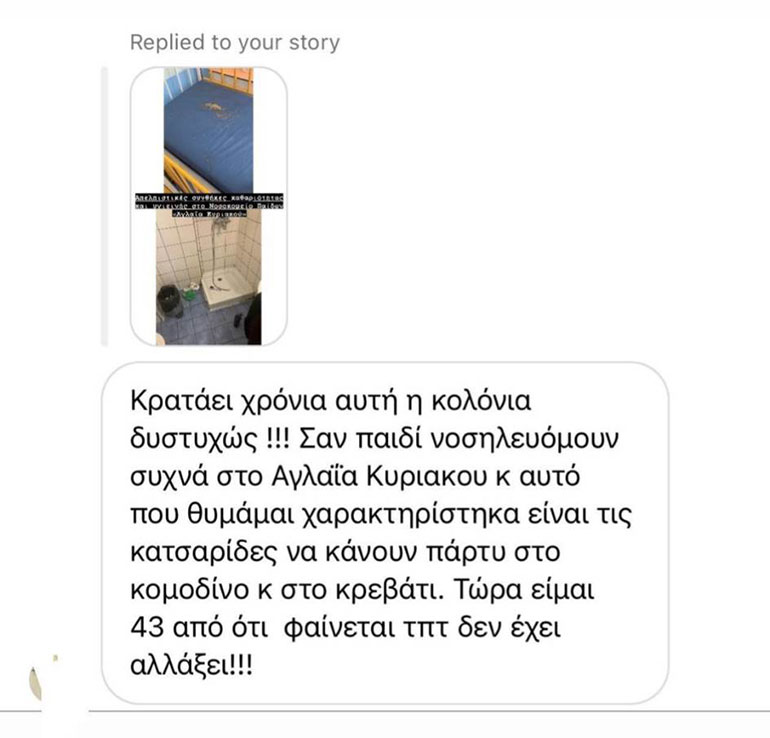 Οι συνθήκες εγκατάλειψης και βρωμιάς που συνάντησε στο δωμάτιο στο οποίο νοσηλεύεται το παιδί της, μαζί με ένα ακόμη παιδάκι το οποίο έχει παρά φύσιν έδρα, είναι πραγματικά αηδιαστικές. Τις συνθήκες αυτές τις γνωστοποίησε από την πρώτη στιγμή στο νοσηλευτικό και ιατρικό προσωπικό του νοσοκομείου, φοβούμενη για την υγεία του παιδιού της αλλά και της ίδιας. Σαν να το ήξερε ότι κάτι θα συμβεί, αφού μια μέρα μετά (σ.σ. σήμερα 16 Μαρτίου) η ίδια αλλά και το 2,5 ετών παιδί της προσβλήθηκαν από γαστρεντερίτιδα.