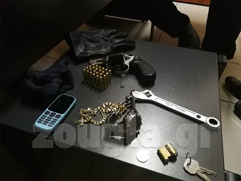 Στην κατοχή τους έφεραν ένα 38αρι περίστροφο γεμάτο φυσίγγια καθώς και ένα γαλλικό κλειδί. Οι δράστες ομολόγησαν στους αστυνομικούς ότι στόχος τους ήταν η κλοπή του διαμερίσματος στον πρώτο όροφο καθώς σε αυτό κατοικεί άτομο με αναπηρία.