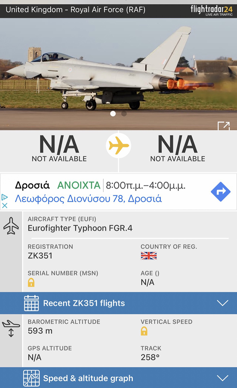 Μεταξύ Κύπρου και Λιβάνου στο ύψος της Αμμοχώστου είναι εμφανής η παρουσία δύο Eurofighter.