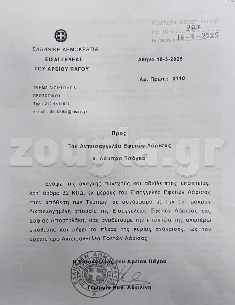 «Ενόψει της ανάγκης συνεχούς, αδιάλειπτης εποπτείας εκ μέρους του Εισαγγελέα Εφετών Λάρισας στην υπόθεση των Τεμπών σε συνδυασμό με την επί μακρόν δικαιολογημένη απουσία της Εισαγγελέως Εφετών Λάρισας κας Σοφίας Αποστολάκη σας αναθέτουμε την εποπτεία της υπόθεσης», σημειώνεται στην ανακοίνωση, με την οποία γνωστοποιήθηκε στον κ. Τσόγκα ότι αναλαμβάνει την υπόθεση.
