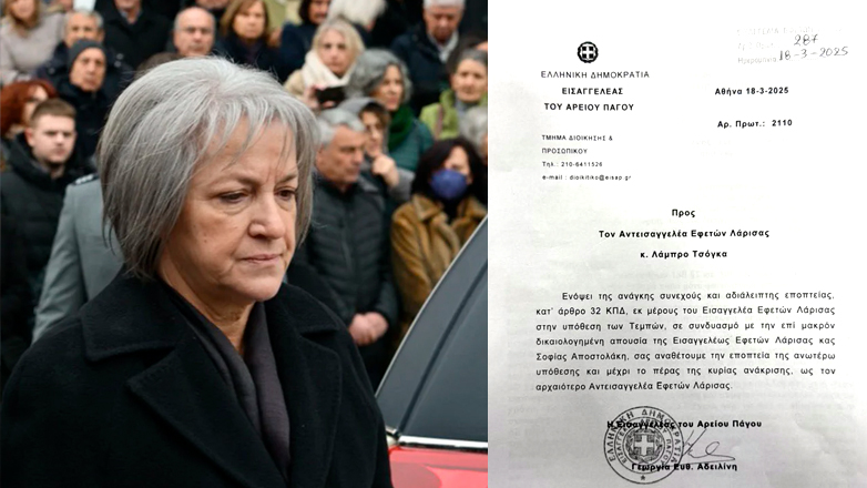 «Ενόψει της ανάγκης συνεχούς, αδιάλειπτης εποπτείας εκ μέρους του Εισαγγελέα Εφετών Λάρισας στην υπόθεση των Τεμπών σε συνδυασμό με την επί μακρόν δικαιολογημένη απουσία της Εισαγγελέως Εφετών Λάρισας κας Σοφίας Αποστολάκη σας αναθέτουμε την εποπτεία της υπόθεσης», σημειώνεται στην ανακοίνωση, με την οποία γνωστοποιήθηκε στον κ. Τσόγκα ότι αναλαμβάνει την υπόθεση.