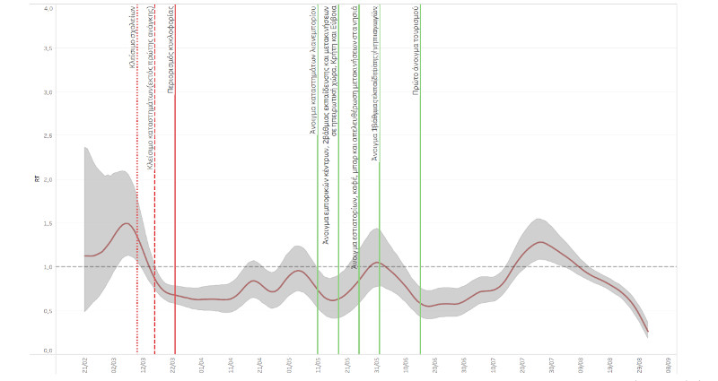 »Το πλήθος των ασθενών στις ΜΕΘ αυξήθηκε σε 38 από 31, ενώ ο μέσος όρος του αριθμού των θανάτων αυξήθηκε σε 4. Σύμφωνα με τα διεθνή διαθέσιμα δεδομένα, η Ελλάδα εξακολουθεί να βρίσκεται σε σχετικά καλή κατάσταση στον δείκτη θανάτων λόγω COVID ανά 1 εκατ. κατοίκους (111η θέση / 26 θάνατοι ανά 1 εκατ. κατοίκους), όταν ο μέσος όρος παγκοσμίως είναι 113,7 θάνατοι ανά 1 εκατ. κατοίκους. Ο ρυθμός διπλασιασμού των κρουσμάτων διαμορφώθηκε σε 24 από 28 ημέρες, ενώ των θανάτων ανήλθε στις 125 από 123 ημέρες. Σημειώθηκε επομένως επιτάχυνση στα κρούσματα και σχετική επιβράδυνση στους θανάτους, αναφορικά με την προηγούμενη έκθεση. Με βάση τις παραπάνω τάσεις, το Rt εκτιμάται σε 0,72».