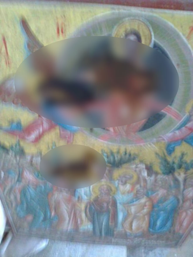 Αργά το βράδυ της Κυριακής, βοσκός που πέρασε από την εκκλησία με τη σύζυγο του διαπίστωσε μια άνευ προηγουμένου βεβήλωση στο μικρό εκκλησάκι του Χριστού. Υπάνθρωποι είχαν αφοδεύσει και είχαν ουρήσει παντού μέσα στον χώρο και είχαν αλείψει όλες τις εικόνες με κόπρανα. Μάλιστα σε μια έγραψαν στα Ελληνικά «Φάτε σκ..α κερνάει ο Δίας».