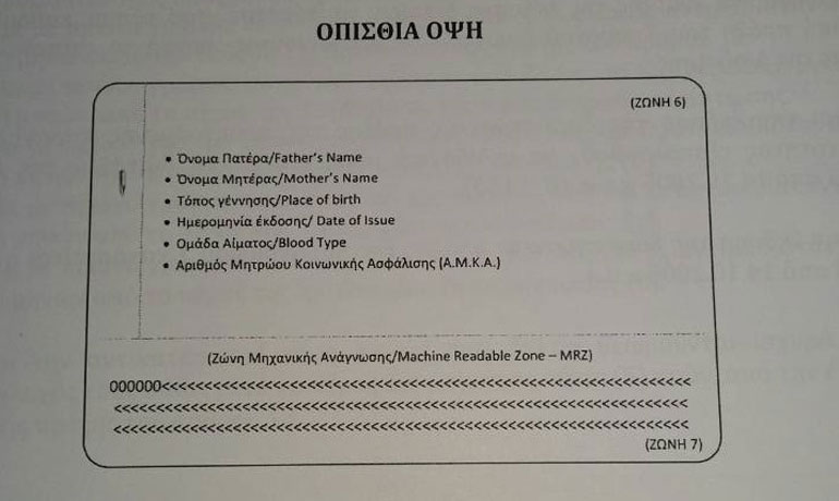 Ζώνη 6: Όνομα Πατέρα, Όνομα Μητέρας, Τόπος γέννησης, Ημερομηνία έκδοσης, Ομάδα Αίματος, Αριθμός Μητρώου Κοινωνικής Ασφάλισης (Α.Μ.Κ.Α.), ψηφιακό δακτυλικό αποτύπωμα