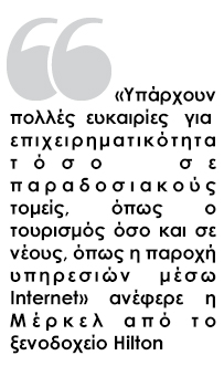 Ιδιαίτερο ενδιαφέρον για τον βαθμό αξιοποίησης της τεχνολογίας στην Ελλάδα έδειξε η καγκελάριος της Γερμανίας κατά τη διάρκεια της παραμονής της στο ξενοδοχείο Hilton, όπου διεξήχθη επιχειρηματικό forum με τη συμμετοχή νέων επιχειρήσεων από τον χώρο της τεχνολογίας, κυρίως start ups.