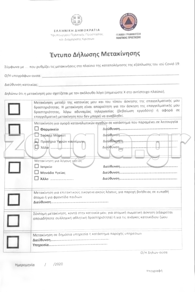 Αυτή είναι η φόρμα που θα συμπληρώνουν οι πολίτες όταν επιβληθεί απαγόρευση κυκλοφορίας για να εξέλθουν της κατοικίας τους