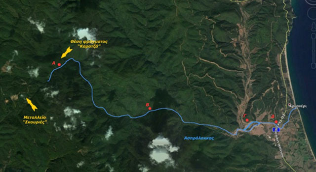 Όπως αποτυπώνεται στον παρακάτω χάρτη, νερά με αφρούς έχουν φωτογραφηθεί σε όλο το μήκος του Ασπρόλακκα, από τον Καρατζά στις Σκουριές μέχρι και λίγο πριν την εκβολή του στη θάλασσα (θέσεις Α, Β, Γ και Δ)