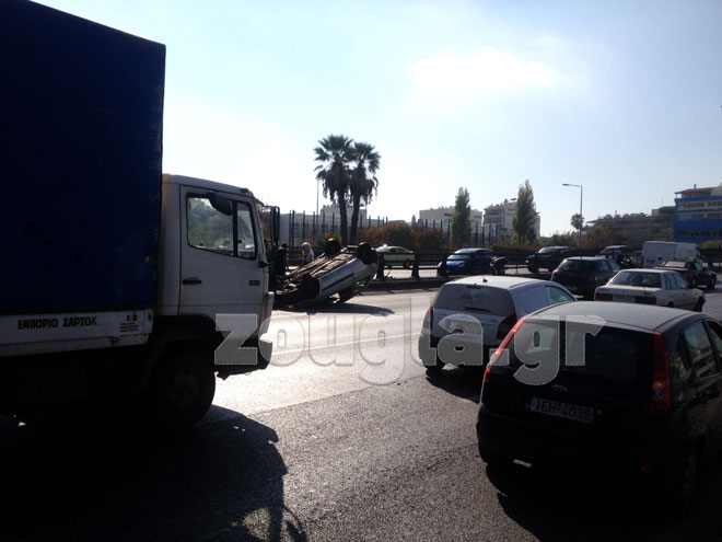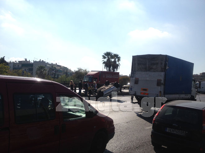 Ένα Ι.Χ. αυτοκίνητο συγκρούστηκε στο διαχωριστικό διάζωμα και ανατράπηκε από άγνωστη μέχρι στιγμής στην Εθνική Οδό και συγκεκριμένα στο ρεύμα προς Πειραιά στο ύψος της εξόδου του Περιστερίου.