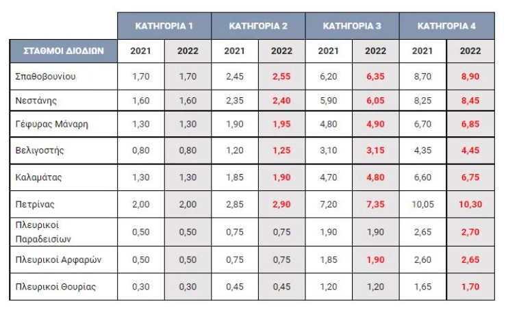 Από την προαναφερθείσα τιμαριθμική αναπροσαρμογή, και μετά από δύο συνεχή έτη μειώσεων, προκύπτουν μικρές αυξήσεις τιμών σε ορισμένους σταθμούς διοδίων και σε ορισμένες κατηγορίες οχημάτων, οι οποίες απεικονίζονται με κόκκινο χρώμα στον παρακάτω πίνακα. Οι υπόλοιπες τιμές (με μαύρο χρώμα) λόγω στρογγύλευσης δεν επηρεάζονται και παραμένουν ίδιες με αυτές του 2021: