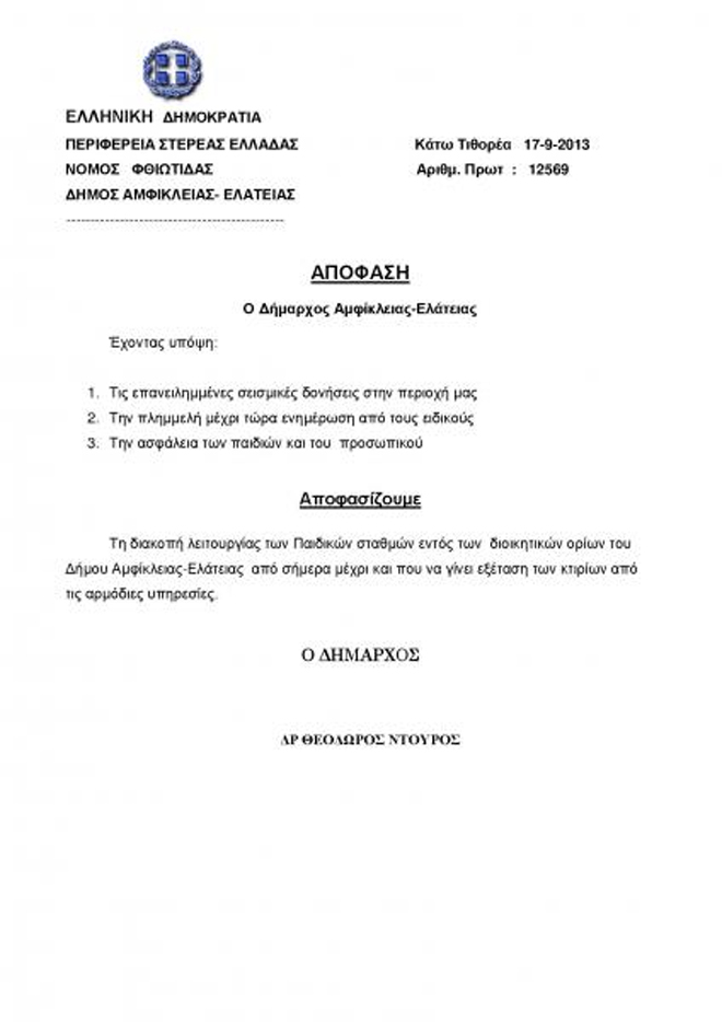 Με απόφαση του δημάρχου κ. Θεόδωρου Ντούρου, θα παραμείνουν κλειστά, μέχρι να γίνει επανέλεγχος των κτηρίων από τις αρμόδιες υπηρεσίες, οι παιδικοί σταθμοί, τα νηπιαγωγεία, τα δημοτικά, τα γυμνάσια και τα λύκεια που βρίσκονται εντός των διοικητικών ορίων.