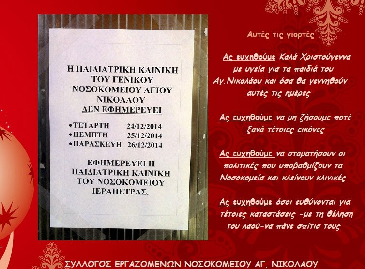 Δεν εφημερεύει, παραμονή των Χριστουγέννων, ανήμερα των Χριστουγέννων αλλά και την Παρασκευή, η παιδιατρική κλινική του Νοσοκομείου Αγίου Νικολάου!