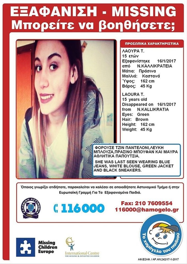 Στη δημοσιότητα δόθηκε το βράδυ της Τρίτης η φωτογραφία της 15χρονης μαθήτριας που αγνοείται στη Χαλκιδική.