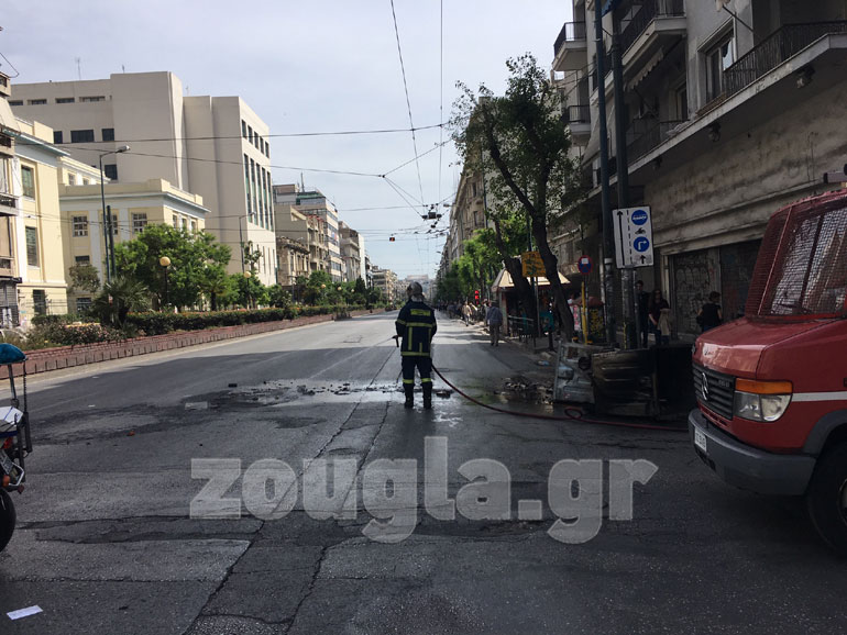 Τα άτομα αυτά πέταξαν φέιγ βολάν με συνθήματα υπέρ του Δημήτρη Κουφοντίνα, ενώ η Πυροσβεστική που έσπευσε στα τρία σημεία έσβησε αμέσως τις φωτιές στους κάδους.