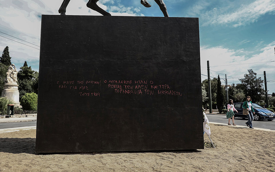 Οι άγνωστοι πιθανότατα το βράδυ της Τρίτης και χωρίς να γίνουν αντιληπτοί έγραψαν συνθήματα στο βάθρο του γλυπτού και στη συνέχεια τράπηκαν σε φυγή.