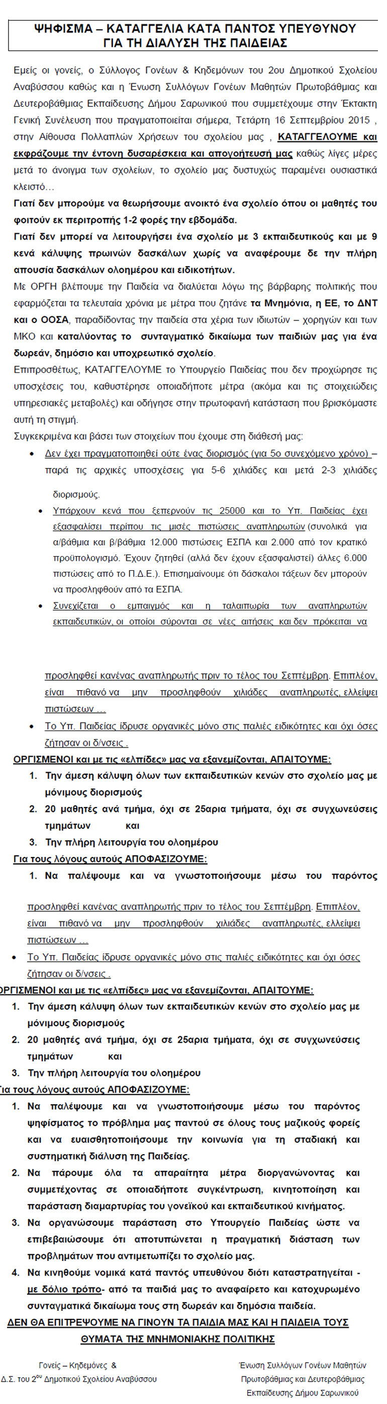 Αγώνα ξεκίνησαν γονείς και μαθητές του 2ου Δημοτικού Σχολείου Αναβύσσου, καθώς και η Ένωση Συλλόγων Γονέων του Δήμου Σαρωνικού, καθώς η Παιδεία διαλύεται με το αρμόδιο Υπουργείο να παρακολουθεί τις εξελίξεις.
